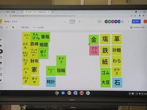 タブレットを使って、物質の性質を利用して区分する授業が展開されていました。仲間分けすることや、意見の共有をすることにタブレットが効果的に使われていました。