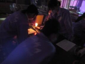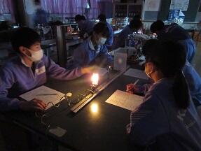 凸レンズを通ると光はどうなるかを確かめる実験を行っていました。どのグループも協力して実験を進めていました。