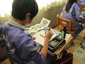 書き初めの「窓辺の花」の「の花」を練習していました。みんな、なかなかの文字を書いていました。