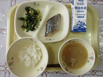 今日の給食は、立春メニューで、ご飯、牛乳、さわらの味噌焼き、菜の花和え、豆乳仕立ての野菜汁です。高根沢町で生産された物は、味噌、豆腐、にんじん、大根、ねぎ、米です。今日もたいへんおいしく頂きました。