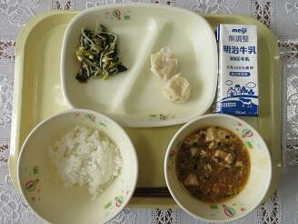 今日の給食は、ご飯、牛乳、マーボー豆腐、えび焼売、ナムルです。高根沢町で生産された物は、豆腐、味噌、にんじん、ねぎ、米です。今日もたいへんおいしく頂きました。