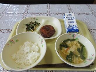 今日の給食は、ご飯、牛乳、ソースメンチカツ、おひたし、干ぴょう入りかき卵汁です。高根沢町で生産された物は、豆腐、米です。今日もたいへん頂きました。
