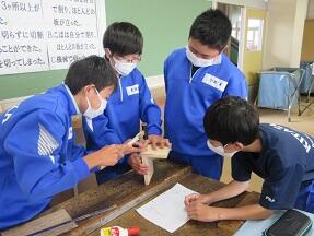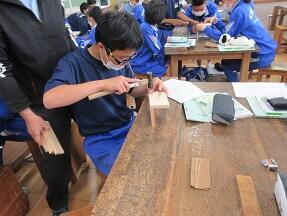 グループで1枚の板を切って、釘で打って、ワックスを塗っての工程を経験していました。この先の個人製作に向けての練習です。
