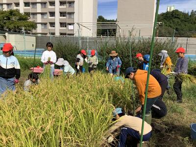 10月2日(木)に稲刈りをしました。前日の雨で田んぼが少しぬかるんでいましたが、無事刈り取りを終え、全てのコメを収穫することができました。