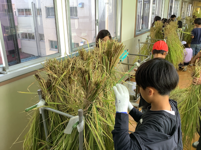 刈り取った稲は三階の日当たりの良い廊下に干しました。