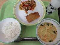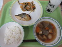 ごはん、けんちん汁、さわらの西京焼き、豚肉と小松菜のピリ辛炒め、牛乳でした。