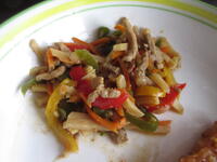 チンジャオロースには、赤・黄・緑の3色のピーマンと人参、竹の子が入っていて