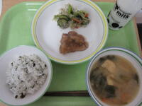 わかめごはん、根菜のごま汁、鶏肉のバーベキューソース、野菜のゆかり和え、牛乳でした。