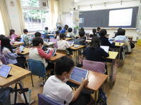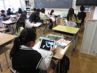 理科室にある骨格標本を見ながらの説明ではなく、実際に子供たちがタブレット端末