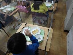 給食では、最も神経を使っています。パーテーション使用の他に、食べている時以外は、待っている時(配膳中)、食べ終わった後もマスクを着用しておしゃべりを我慢しています。黙食も慣れてきました。