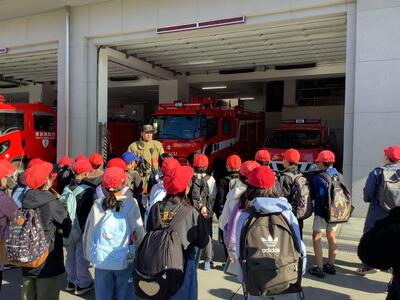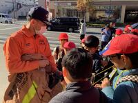 消防署や消防車のことについて授業中によく調べていたこともあり、消防士さんから質問が出されると、子どもたちは元気よく手をあげ、自信をもって発表していました。