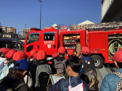 初めて近くで見る大きな消防車に、みんな目を輝かせていました。