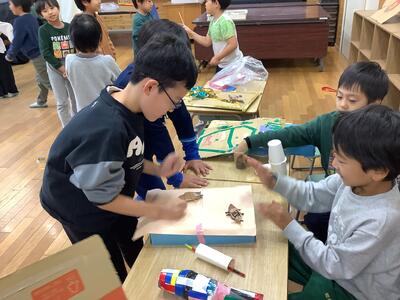 子どもたちは自分が作った作品が展示された様子を見て、とてもうれしそうに眺めたり、作成中の苦労や作品の工夫を語ったりしていました。友達の作品の良さや素晴らしさを伝え合う姿も見られ、温かい雰囲気の中、鑑賞の授業を行いました。きょうだい班に別れて鑑賞した際には、共同作品を見たり触れたりして一緒に楽しんだり、互いの作品を紹介し合ったりして交流を深めました。