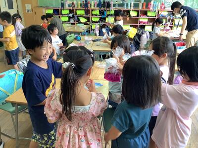 夏休み中に咲いたあさがおの花を使って、いろみずを作りました。