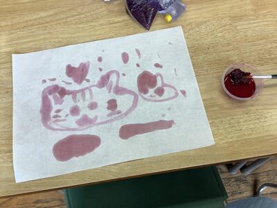 できた色水でしたいこと聞き、取り組んでみました。絵を描いたり、折り染めをしたりしました。