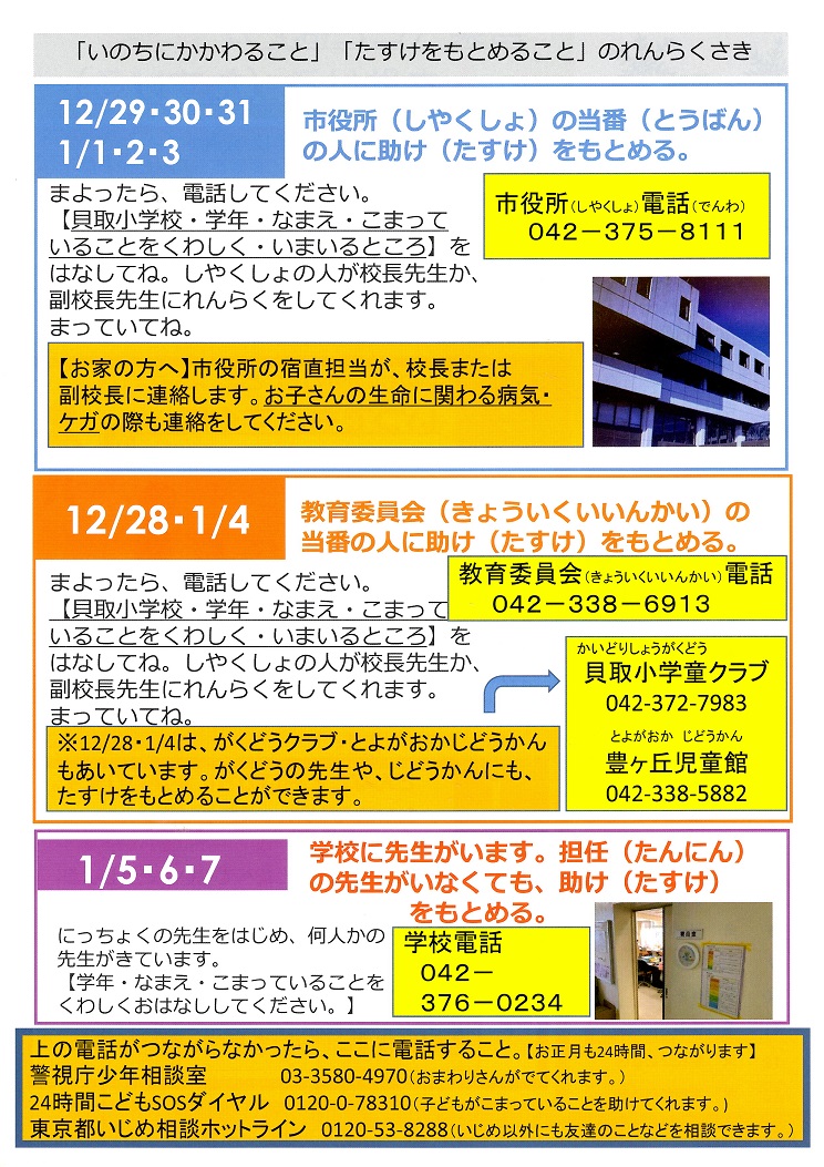 学校に教職員が不在となる年末年始に「困ったときの対応の仕方」についてまとめたリーフレットです。