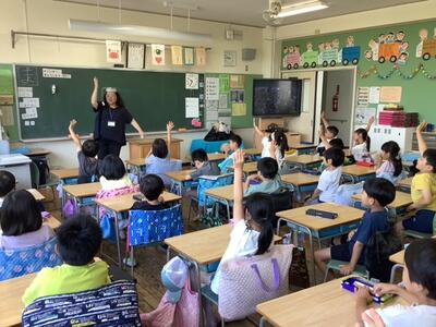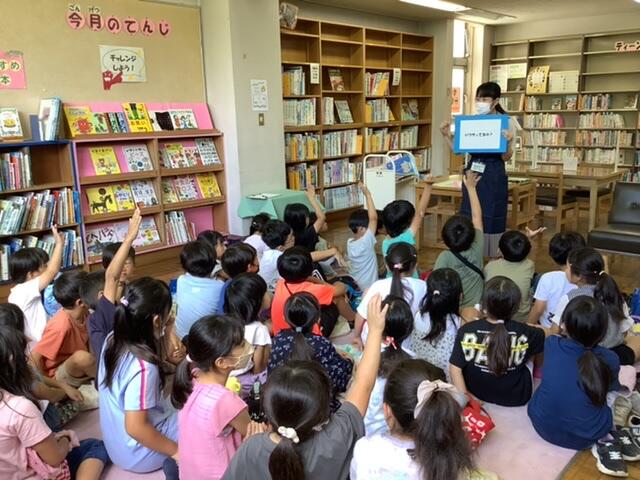 司書の方が、クイズ形式で図書館の説明をしてくださいました。赤ちゃんから大人までいろいろな人が利用すること、点字の本やCDの貸し出しもあることがわかりました。一番驚いていたのは、貸出冊数で、何と45冊まで!でした。