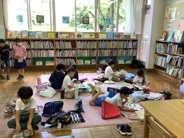 お話を聞いた後は、本を1冊選んで実際に借り、机やカーペットの上で読書をしていました。