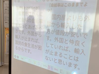 日本の食料自給率は上げるべきなのか、このままでよいのか、様々な視点で考え話し合おう。