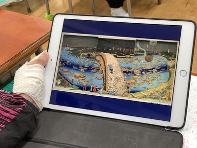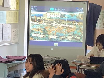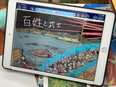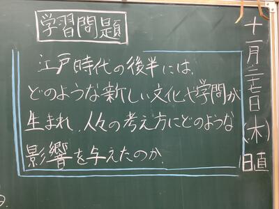 授業の前段で参考にした江戸や大阪の町の様子や、西洋から入ってきた学問、美術•芸術等の資料について学びながら、明日からの学習テーマになる学習問題をつくりました。