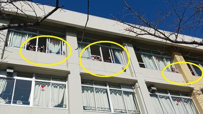 5年生の出発時に、校舎の4階から大きな声援が聞こえてきました。