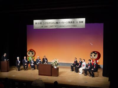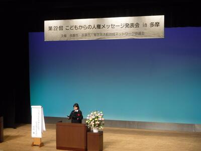 この発表会は、多摩市からは全17校の代表児童が、近隣市からも市の代表児童が参加して、人権メッセージの発表をしました。