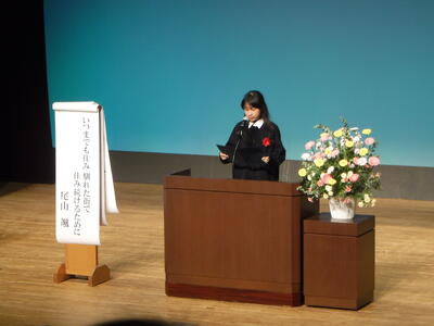 尾山さんは、様々な人たちが集い合える「居場所」の運営に参加しているご家族と共に、自身が見たり感じたりした経験を語り、多様な人たちが安心して住み続けられるために大切なことを、自分の言葉で発表しました。