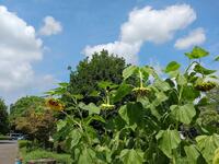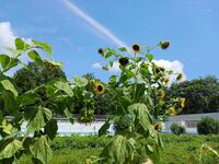 茎をどんどん伸ばし3m近くまで成長したひまわりも、花びらが散り、少しずつこうべを垂れ始めています。