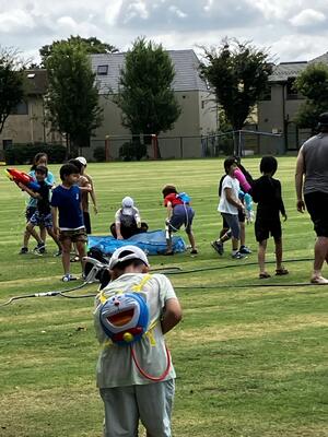 芝生管理作業の終了後は、芝生開放デーとして、おやじの会の皆さんが主催する「水遊び」をおこないます。