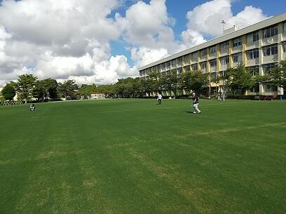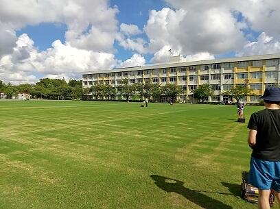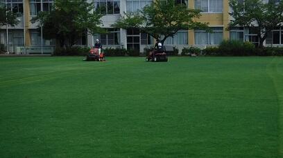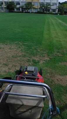 今日に芝刈りは、校舎に対して垂直方向に刈り進みました。