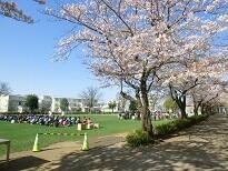 冬芝の緑に桜のピンクが映えます
