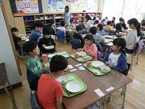 給食の前に配膳の仕方や片付け方を学習し、いよいよ本番です。