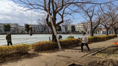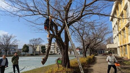本日、おやじの会並びに(おやじの会)OBの方々のお力をお借りし、桜の木の剪定をしました。