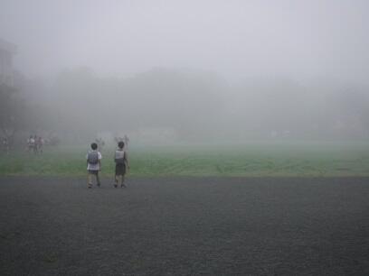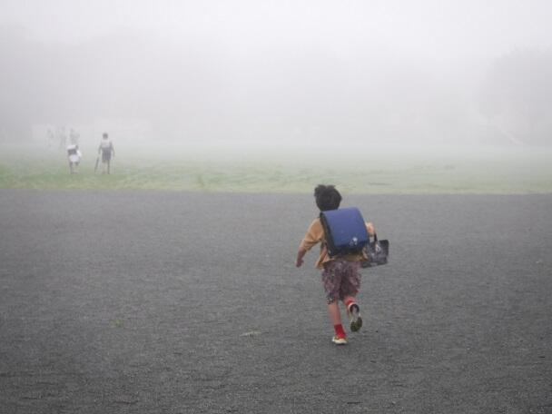 校庭が霧に包まれているのを見て、どの子も歓声を上げていました。