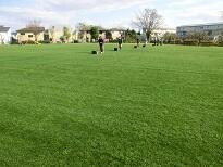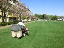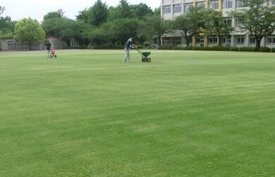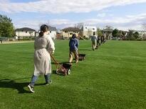 本校の全面芝生校庭は、多摩市教育委員会が芝生校庭管理の専門の方に委託して