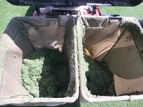 右上写真のように乗用型芝刈り機は刈った芝を紙面に残すようにします。