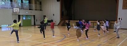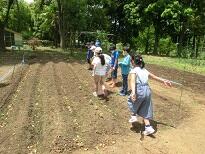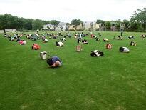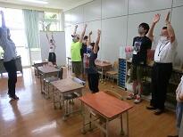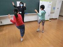 課題の確認が終わった後、校庭の芝生の上で柔軟体操をしました。