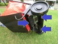 回転しながら刈った芝をブラシでかき取ります。