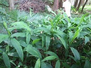 みょうがといっても、右は「やぶみょうが」というもので、葉の付き方が違います。みょうがの茎の皮をむいて食べてみるとほんのりみょうがの味がす。