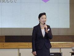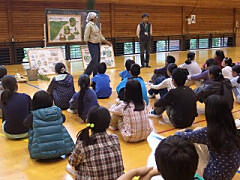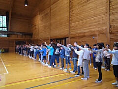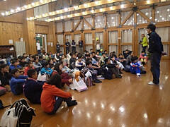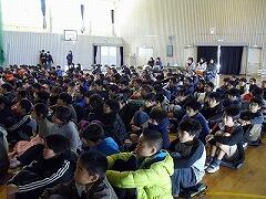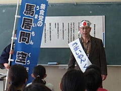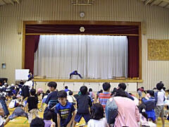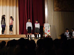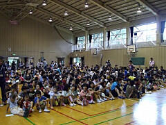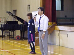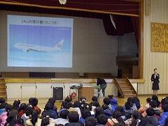 元CAだった江上さんの声はとてもすてきです。保護者や地域の方も参加して、体育館で行いました。