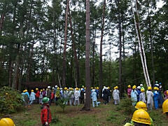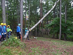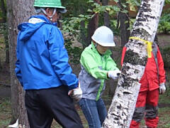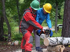 もう一方の白樺は他の木に                            倒した白樺を、チェーンソーで