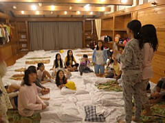 体育館での森林教室に変更です。                 かやという植物の茎を使って