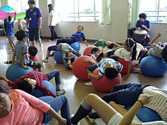 ボールの上ではねたり、体をそらしたりして 友達に押してもらって、乗ってみました。交代し