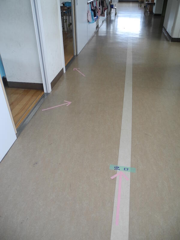階段や廊下、各教室前には、進路を示すマーキングをしてあります。