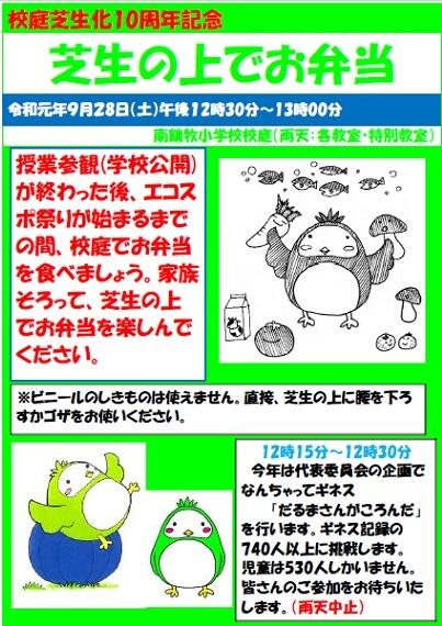 13時15分から15時00まで 校庭芝生化10周年記念 第11回エコスポ祭りを開催します。