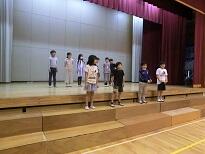 場面ごとに舞台の上や体育館のフロアで練習しています。