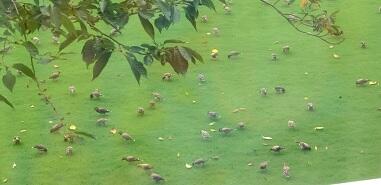 そういえば、昨日も雨の合間に100羽くらいのムクドリが芝生に降り立って