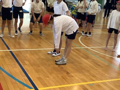 2人1組で体の柔らかさを高める運動に取り組みます。