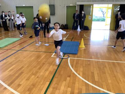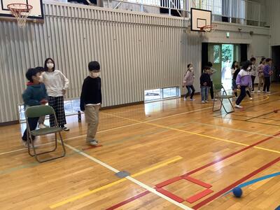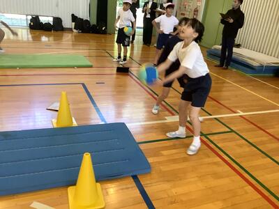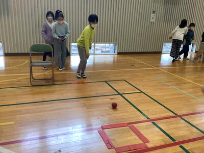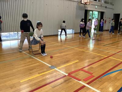 2m程度の距離に設置されている赤い枠内にボールが止まれば得点です。立って投げるだけでなく、座って投げたり、利き手ではない方で投げたり、蹴ったり、様々な投げ方でボールを投げました。