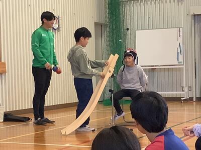 次に、代表児童がランプ(勾配具)を使い、自分の意思をペアに伝えてボールを転がしました。